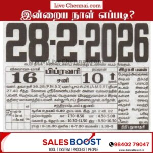 February 28, 2026 – Saturday | Maasii 16 | Visuvavasu Year Auspicious Timings Morning 07:31 AM – 09:000 AM Evening 04:30 PM – 05:30 PM Inauspicious Timings Emakandam 01:30 PM