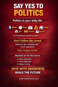 No politics, no life.No politics, no growth.No politics, no leadership.No politics, no development. Say yes to politics. Politics is not something distant. It is part of daily life. Water, food,