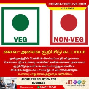 தமிழகத்தில் பேக்கிங் செய்யப்பட்டு விற்பனை செய்யப்படும் உணவு பாக்கெட்களில் சைவம் அசைவம் குறியீடு அவசியம். ஊட்டச்சத்து உள்ளிட்ட விவரங்களும் கட்டாயம் இடம் பெறவேண்டும். -உணவு பாதுகாப்புத்துறை அறிவிப்பு