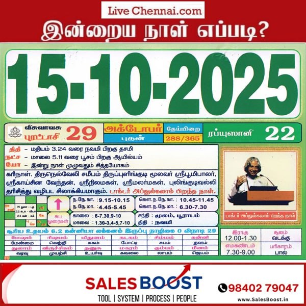October 15, 2025 – Wednesday | Purattaasi 29 | Visuvavasu Year | |||