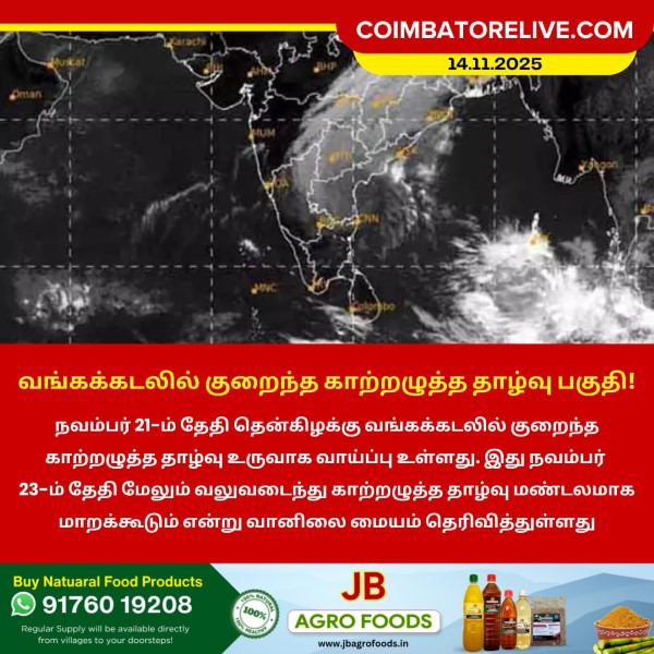 நவம்பர் 21-ம் தேதி தென்கிழக்கு வங்கக்கடலில் குறைந்த காற்றழுத்த தாழ்வு உருவாக வாய்ப்பு உள்ளது. இது நவம்பர் 23-ம் தேதி மேலும் வலுவடைந்து காற்றழுத்த தாழ்வு மண்டலமாக மாறக்கூடும் என்று வானிலை மையம் தெரிவித்துள்ளது.