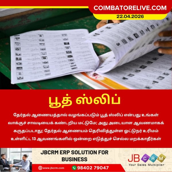 தேர்தல் ஆணையத்தால் வழங்கப்படும் பூத் ஸ்லிப் என்பது உங்கள் வாக்குச் சாவடியைக் கண்டறிய மட்டுமே; அது அடையாள ஆவணமாகக் கருதப்படாது தேர்தல் ஆணையம் தெரிவித்துள்ள ஓட்டுநர் உரிமம் உள்ளிட்ட 13 ஆவணங்களில் ஒன்றை எடுத்துச் செல்ல மறக்காதீர்கள்.