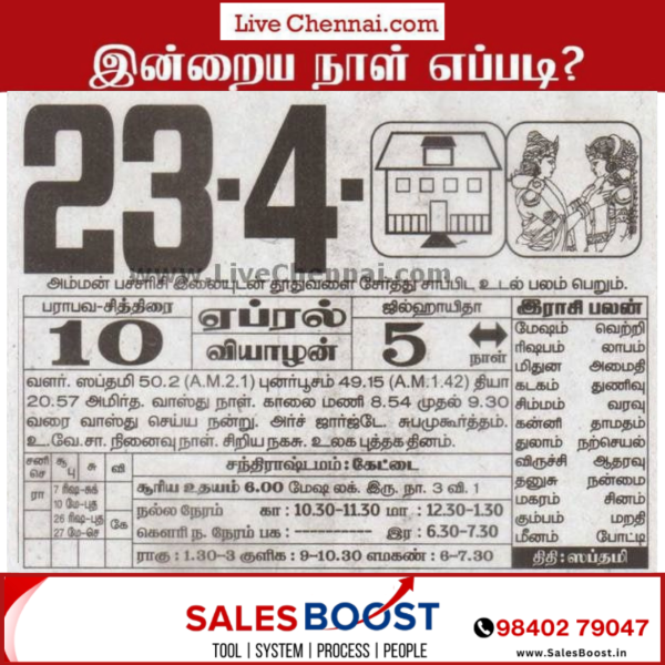 April 23, 2026 – Thursday | Chithirai 10 | Parabhava Year Auspicious Timings Morning 10:30 AM – 11:30 AM Evening 12:30 PM – 01:00 PM Inauspicious Timings Emakandam 06:00 AM – 07:30 AM Gulikai 09:00 AM – 10:30 AM Rahu 01:30 PM – 03:00 PM Astrological Details Thithi Shashti Nakshatram Thiruvathirai Chandrashtamam Keṭṭai Sulam South Remedy Thailam