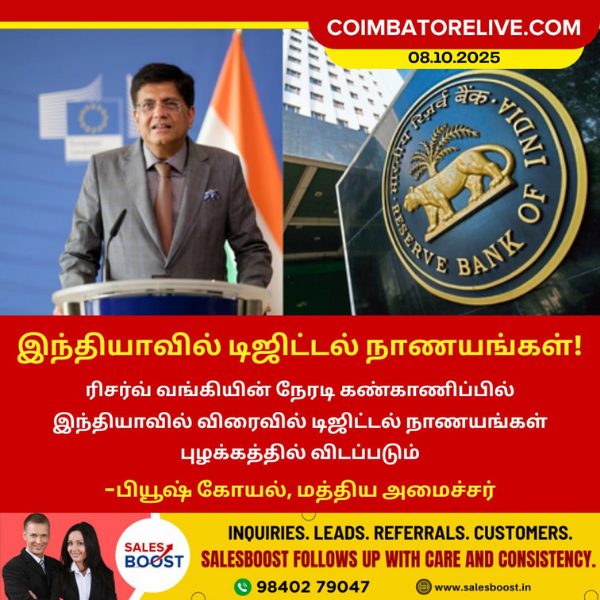 ரிசர்வ் வங்கியின் நேரடி கண்காணிப்பில் இந்தியாவில் விரைவில் டிஜிட்டல் நாணயங்கள் புழக்கத்தில் விடப்படும் – பியூஷ் கோயல், மத்திய அமைச்சர்