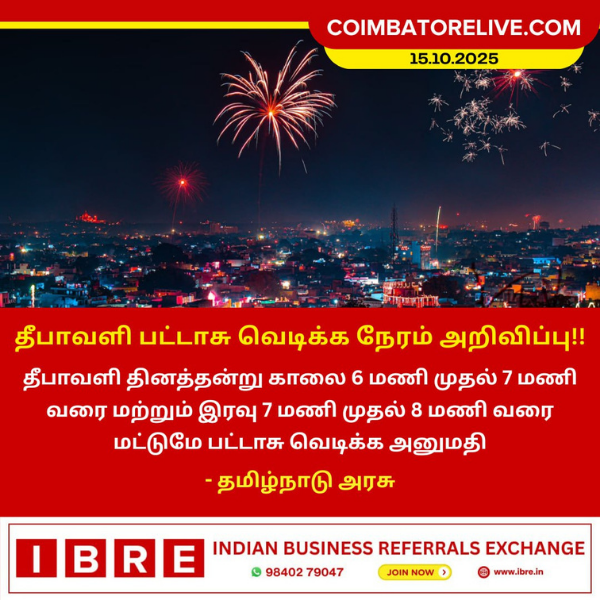 தீபாவளி தினத்தன்று காலை 6 மணி முதல் 7 மணி வரை மற்றும் இரவு 7 மணி முதல் 8 மணி வரை மட்டுமே பட்டாசு வெடிக்க அனுமதி – தமிழ்நாடு அரசு