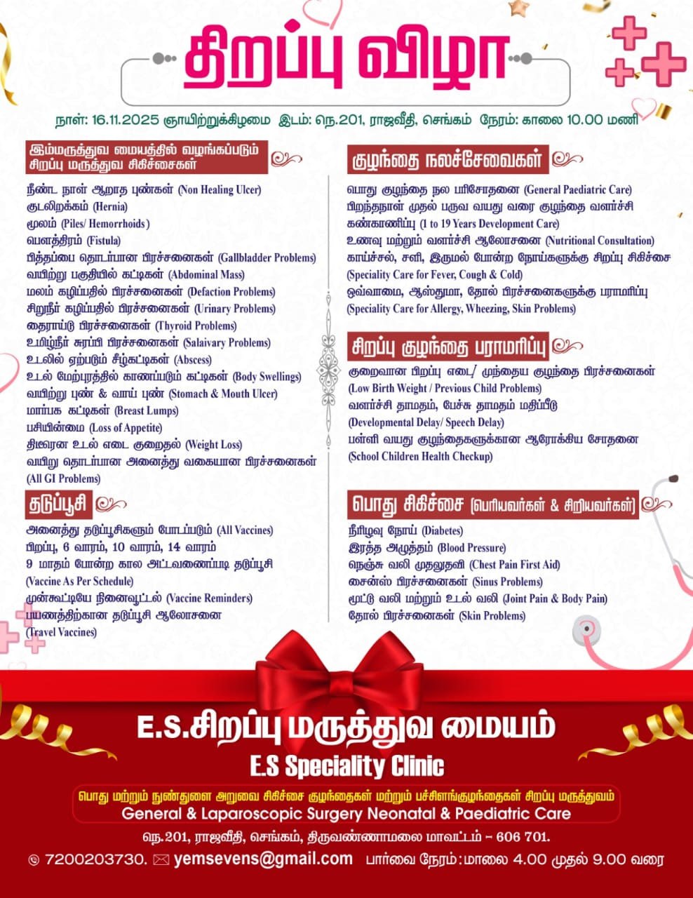 செங்கம் ராஜவீதியில் புதிதாக அமைக்கப்பட்ட E.S. Speciality Clinic மருத்துவ மையம் வரும் 16 நவம்பர் 2025, ஞாயிற்றுக்கிழமை காலை 10.00 மணிக்கு திறந்து வைக்கப்படுகிறது. செங்கம் மற்றும் சுற்றுப்புற மக்களுக்கு தரமான, நுண்துறை மருத்துவ சேவைகளை வழங்குவதற்காக இந்த மையம் தொடங்கப்பட்டுள்ளது.