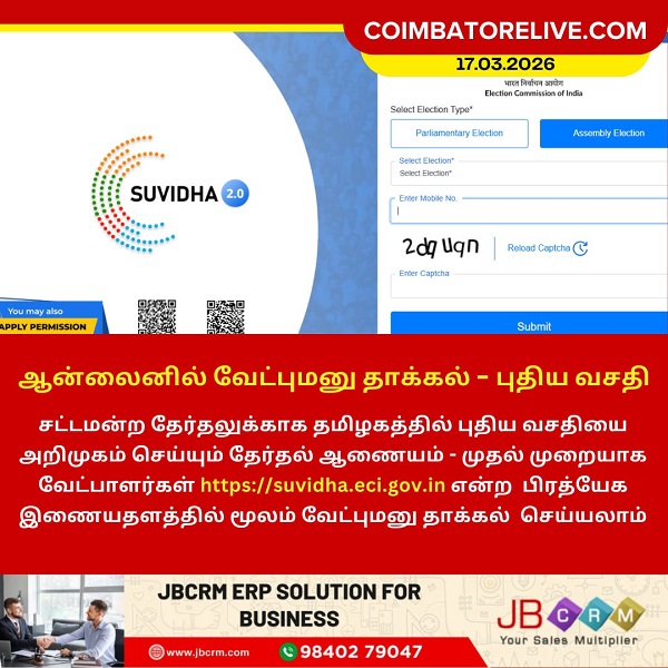 சட்டமன்ற தேர்தலுக்காக தமிழகத்தில் புதிய வசதியை அறிமுகம் செய்யும் தேர்தல் ஆணையம் முதல் முறையாக வேட்பாளர்கள் https://suvidha.eci.gov.in என்ற பிரத்தியேக இணையதளத்தின் மூலம் வேட்புமனு தாக்கல் செய்யலாம்.