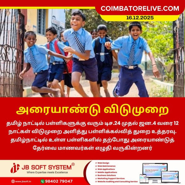 தமிழ் நாட்டில் பள்ளிகளுக்கு வரும் டிச.24 முதல் ஜன.4 வரை 12 நாட்கள் விடுமுறை அளித்து பள்ளிக்கல்வித் துறை உத்தரவு. தமிழ்நாட்டில் உள்ள பள்ளிகளில் தற்போது அரையாண்டுத் தேர்வை மாணவர்கள் எழுதி வருகின்றனர்